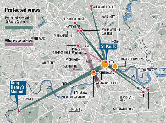 As mentioned, the two main protected views are of St Pauls and lesser so, the Palace of Westminster. (And much less so, The Tower of London.) From Daily Mail October 2018.